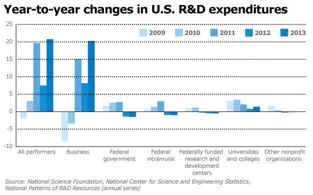 The NSF’s National Center for Science and Engineering Statistics also found that R&D expenditures rose in 2013 over 2012, when they were $435.3 billion.