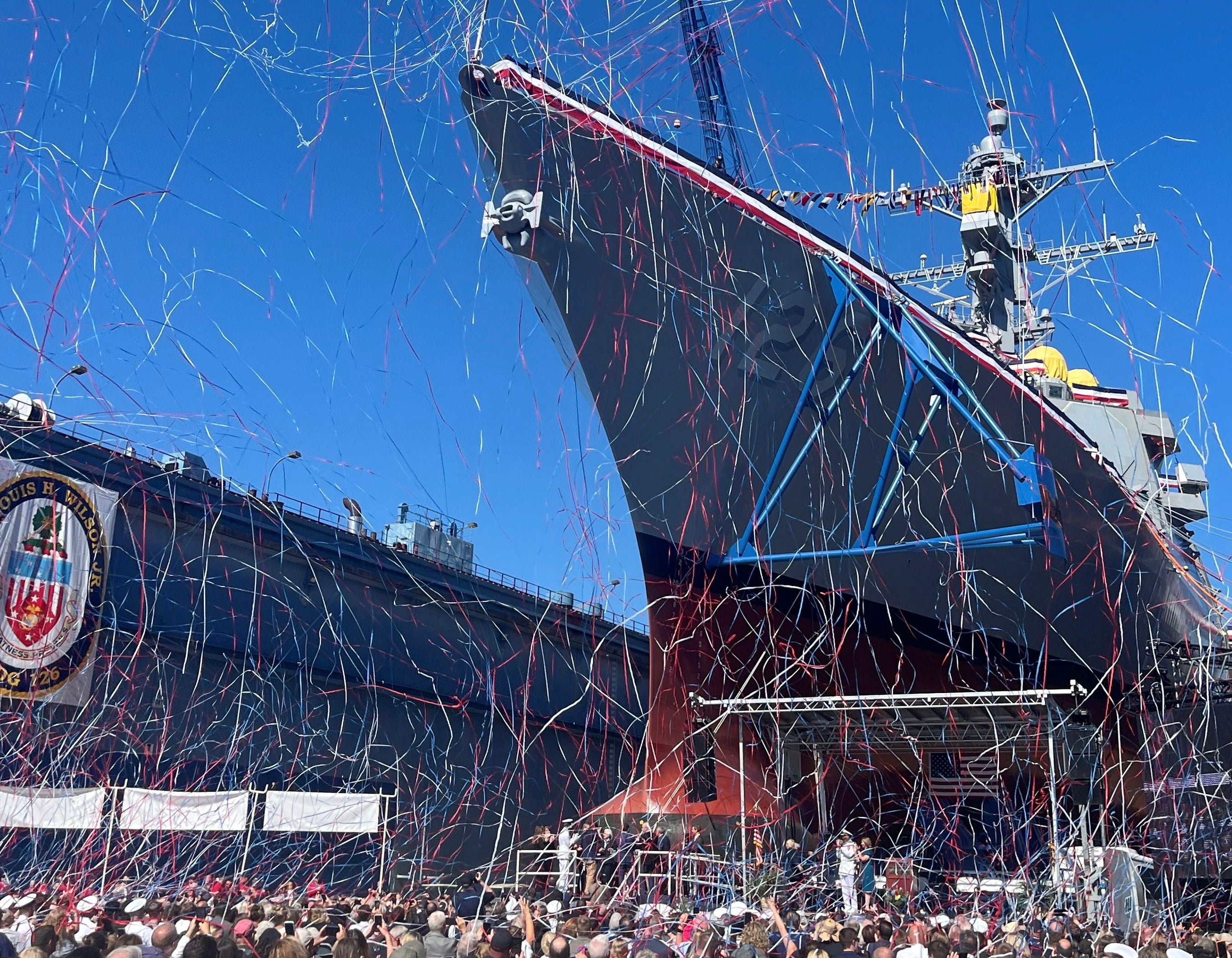 The U.S. Navy’s newest guided missile destroyer, built at Bath Iron Works on Maine's midcoast and officially inaugurated in a weekend christening ceremony, is now in the shipyard’s dry dock waiting to be launched in the coming weeks.