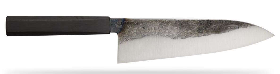 The knives are forged, heat-treated, ground and finished by hand at the 1 Industrial Way workshop. The design is Japanese-inspired with Western influences. The first line to launch is a hybrid with Japanese-style handles and profiles but Western blade construction, which consists of forging a single piece of steel, as opposed to the generally Japanese method of laminated construction. The techniques differ in factors such as hardness, brittleness, stiffness and shape of the blade and the handle. One method is not better than the other, Atwell added.