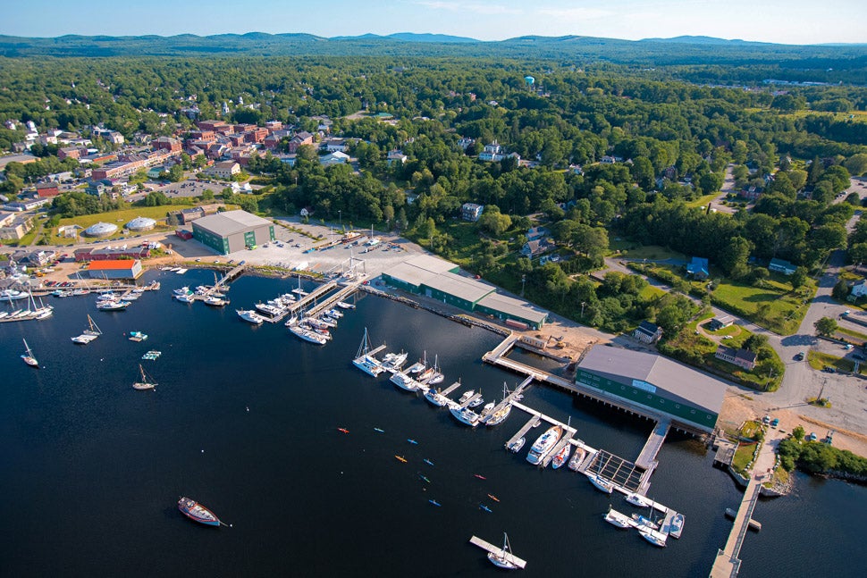 An aerial view of Front Street Shipyard shows its expanse in relation to downtown Belfast (at upper left)
