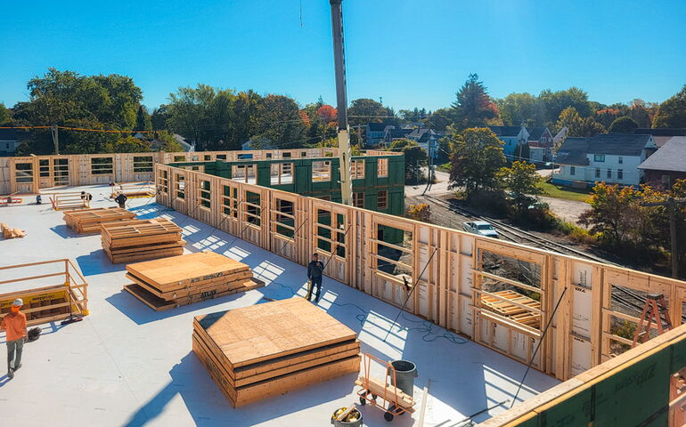 By using prefabricated wooden panels for walls, elevator shafts, floors and roofing, Lewiston-based Hebert Construction is consolidating building time on a 61-unit affordable senior housing project on Seavey Street in Westbrook.