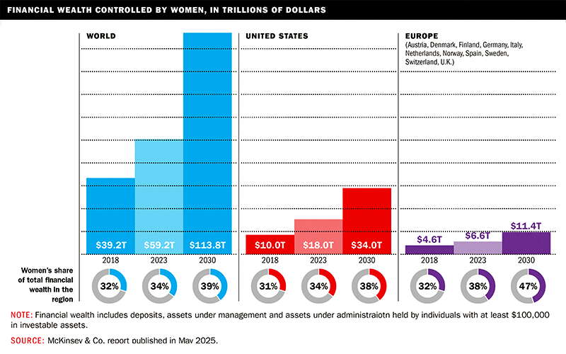 The dollar amounts are staggering. As of 2023, women controlled an estimated $60 trillion in global assets under management. By 2030, that figure is projected to approach $114 trillion, representing 10% growth per year.