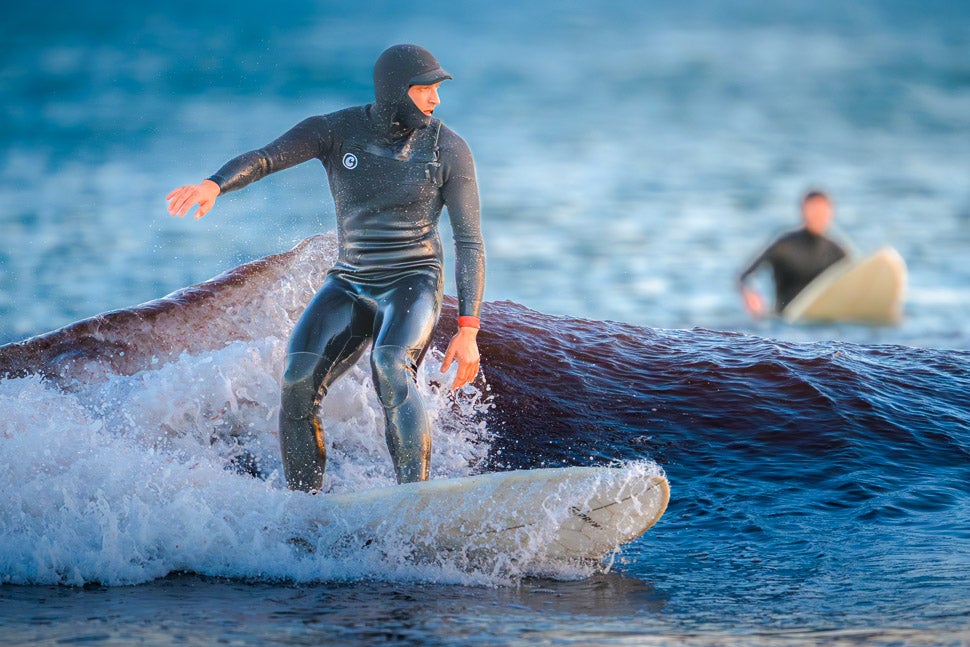 As bright late afternoon melts into dusk at Higgins Beach in Scarborough, Mike Ballin is out surfing on a white translucent board with a honeycomb-like latticed core. Though the waves aren’t at their most powerful, he gets in a few decent rides before sundown.