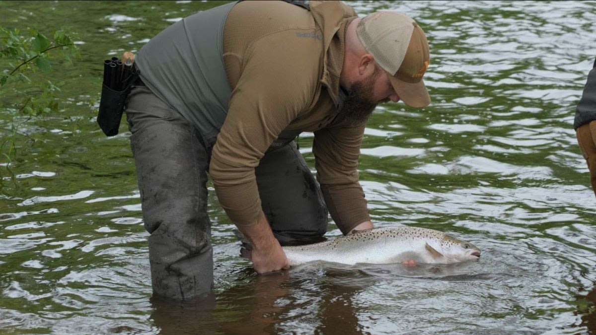 Chuck Loring Jr., Penobscot Nation Department of Natural Resources director, releases an Atlantic salmon into Penobscot Nation waters.