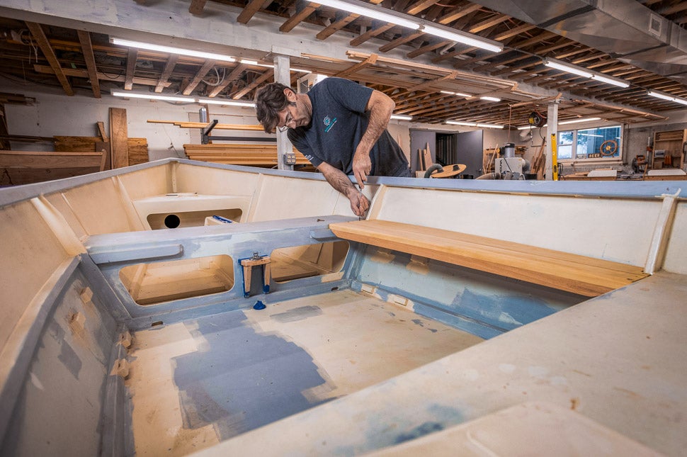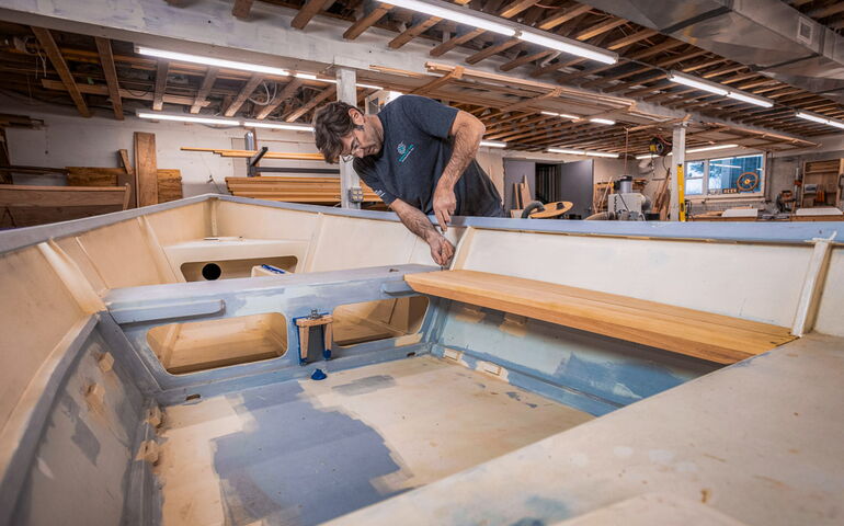 Clint Chase, owner of Chase Small Craft, installs a cedar side bench on a Goat Island Skiff in his shop in Saco. Chase worked with the Midcoast Council of Governments, which he said was responsive to his funding needs.