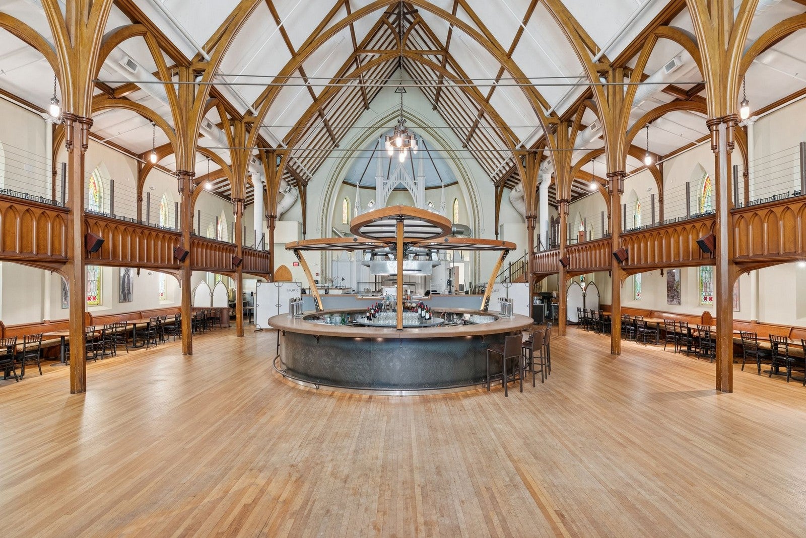 The redesign honored the integrity of the structure — including 27 historic stained glass windows, restored woodwork, exposed beams and cathedral ceilings — while introducing updates, including a restaurant kitchen and custom circular bar. She located an open kitchen at the former altar.