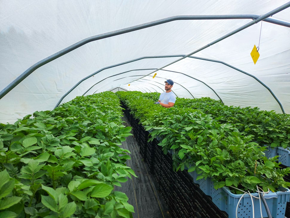 Peter Gerritsen in tending this year’s crop of tissue-culture Potato Plantlets.