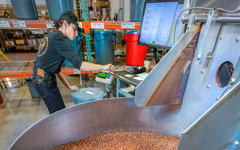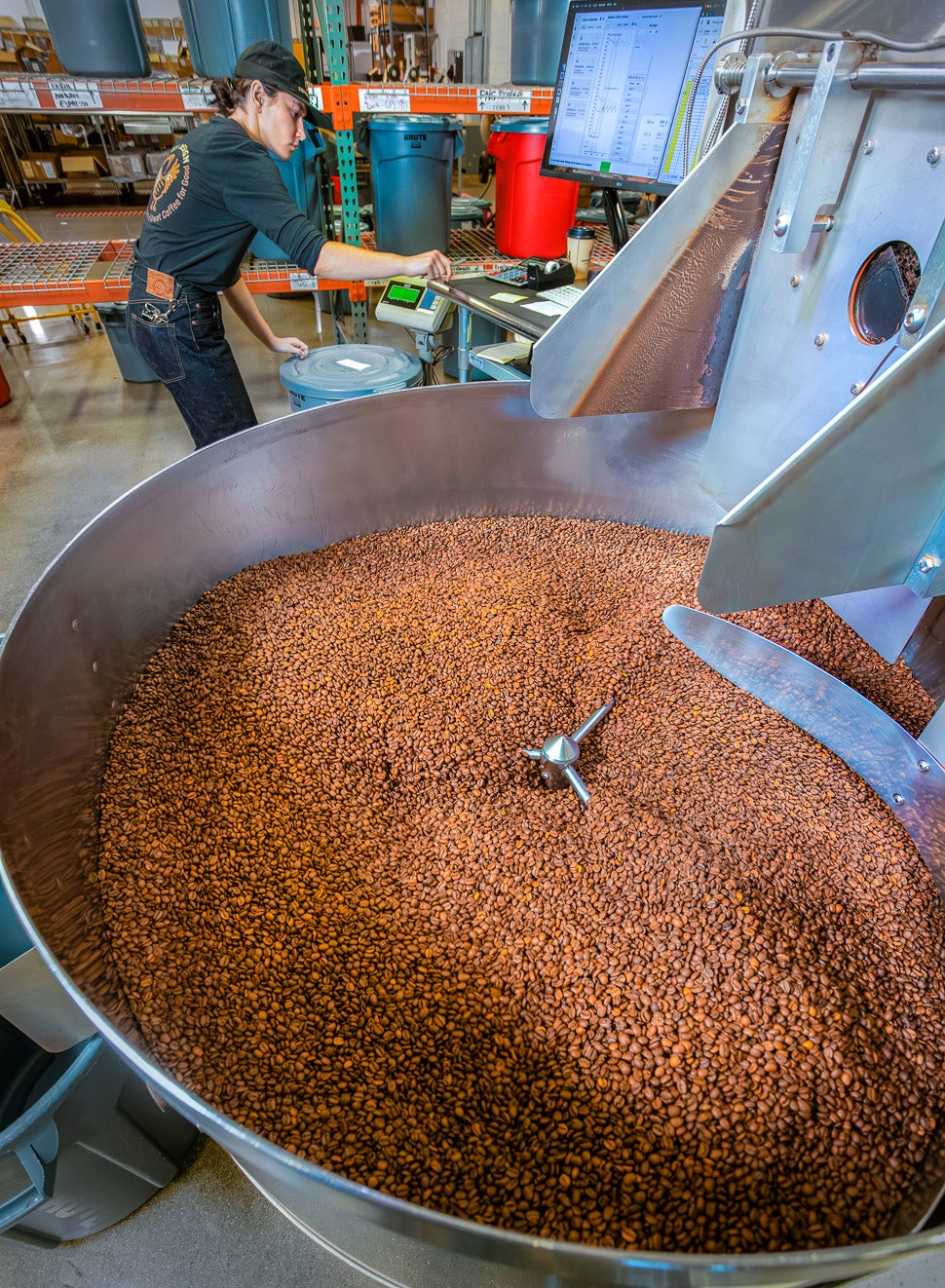 Alina Lindemann Spear, production roaster, Coffee By Design, roasts beans in the roastery in Portland.