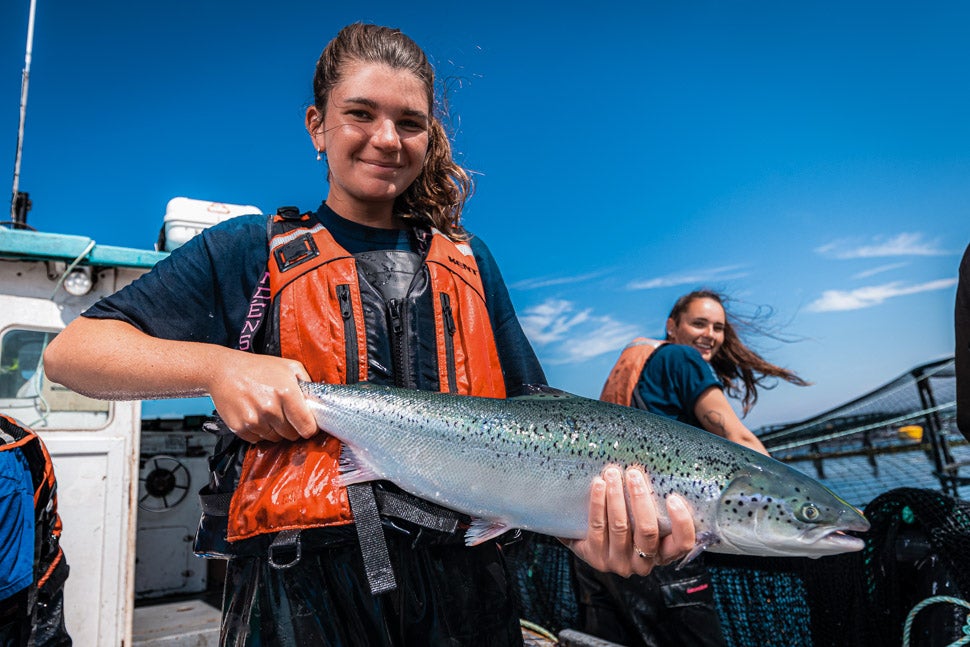 Cooke USA Fish Health Technician Jaelyn Matthews (right) with Megan Robinson weighing fish at a Machias Bay salmon farm.